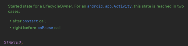 위의 사진을 보면, STARTED는, 안드로이드 라이프사이클에서 onStart 이후와 onPause 이전을 뜻합니다. 내부의 설명을 보죠!