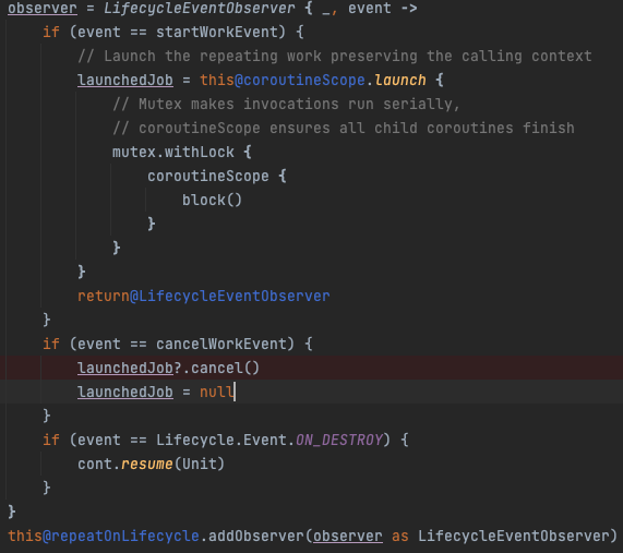 그렇다면 이제, repeatOnLifecycle의 내부를 보면 아래와 같은 코드를 볼 수 있습니다. STARTED를 작성해 주었을 때,