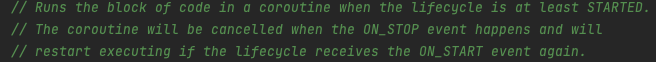 코루틴 안에있는 블럭을 최소 STARTED 상태에서 (STARTED를 썼을때 이야기입니다) 수행한다.